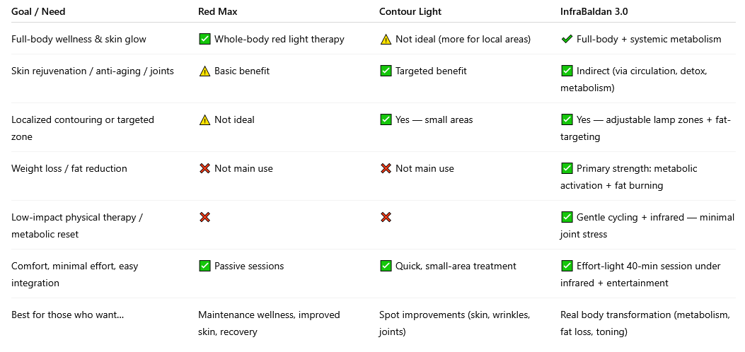 At BLT, we believe in giving you more than “just red light.” That’s why we now offer three distinct devices — each designed for a specific goal and user. Whether you want full-body rejuvenation, targeted contouring, or metabolic reset — there’s a device here for you.